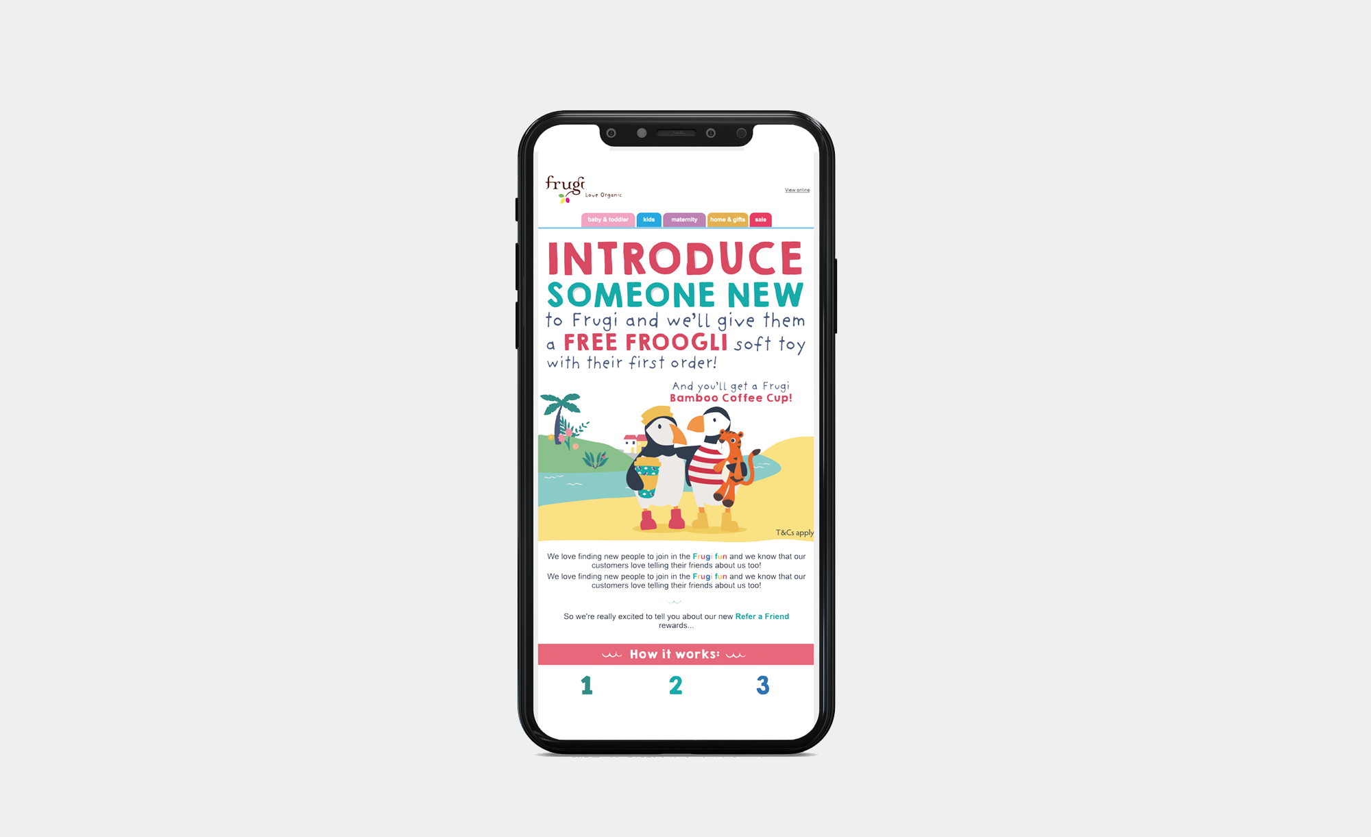Designed Frugi’s launch graphics for its first ever Refer-A-Friend marketing campaign, with MentionMe (achieving a share rate of 28%, purchase rate of 31%), and won the People’s Choice Award.